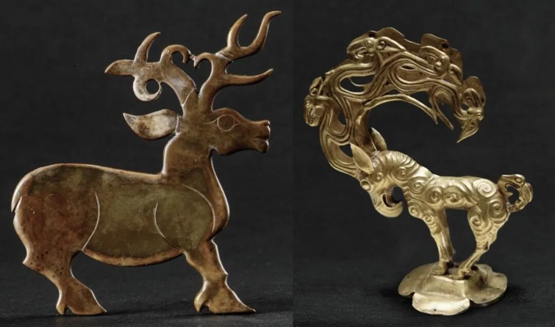陕西出土的玉鹿(左),类似于草原文化的动物形象,年代为公元前10世纪。陕西神木出土的金鹿(右),带有格里芬的喙和角,边缘饰有猛禽头,年代为公元前4世纪至前3世纪。西伯利亚巴泽雷克墓地出土的木制马笼头饰有同样的角,这表明了跨越草原地带的广泛交流。出版方供图