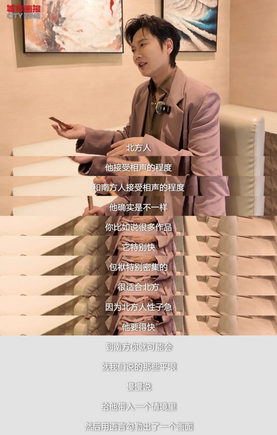 它分作品,比如说很多作品它特别快、包袱特别密集的,很适合北方,因为北方人性子急,他要得快,你必须得非常快地给他感受到,包袱一个接着一个。而到南方,我们得慢慢给他说,将他带入情境里,用语言勾勒出一个画面,他自己在脑子里再想,慢慢地进入包袱。